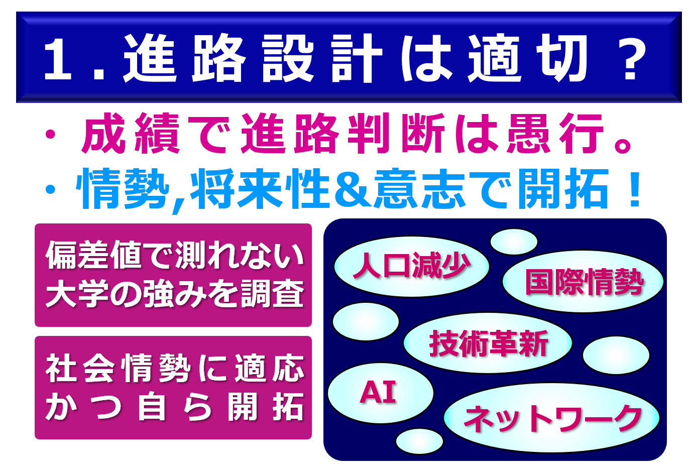 知識は普遍的なもの過去のものありますが、進路指導において重要なことは将来の予測と希望です。単にどうなるかを考えるだけでなく、社会がどうなってほしいか、自分がどう関わるかを想像することが大切です。